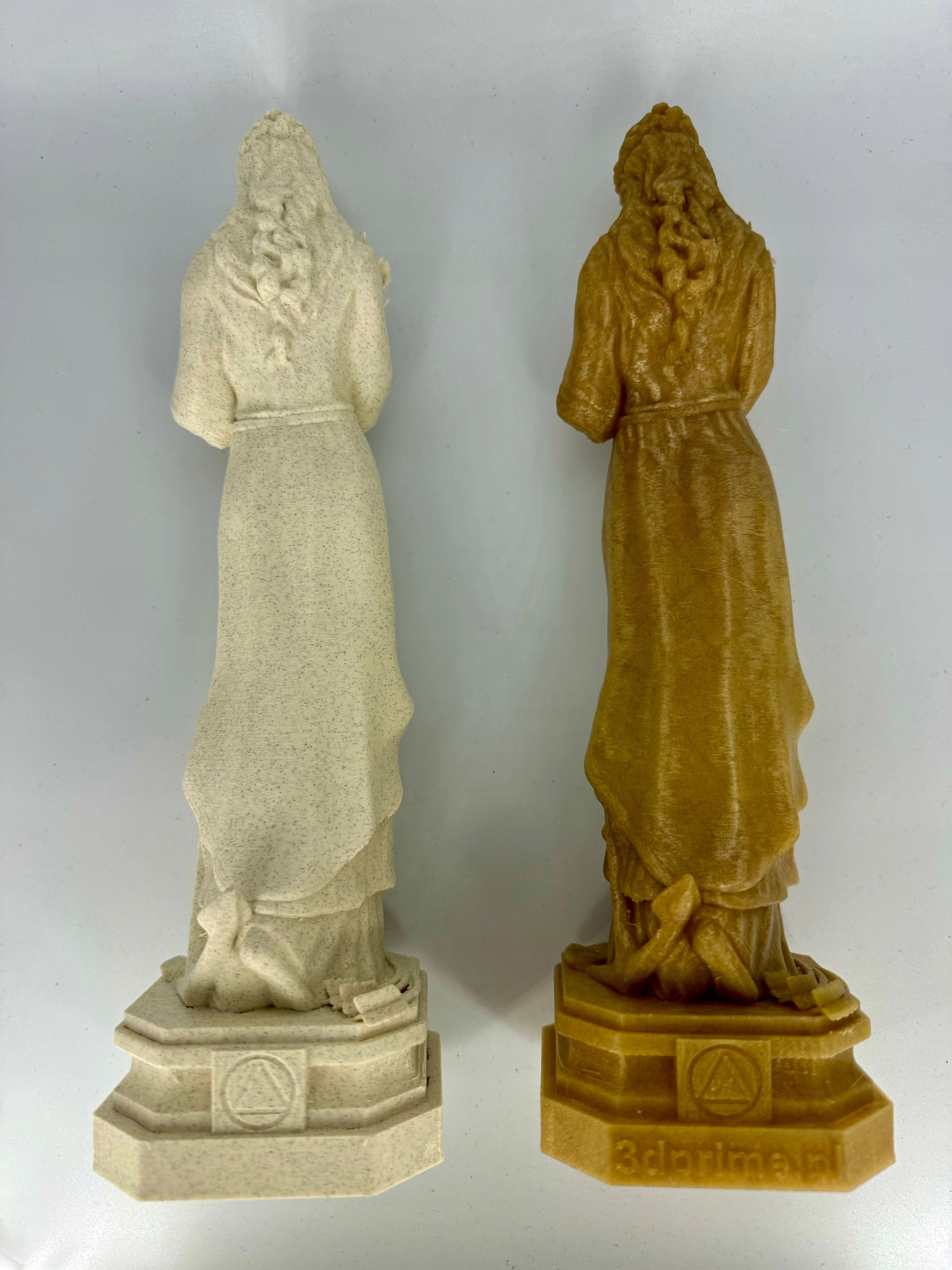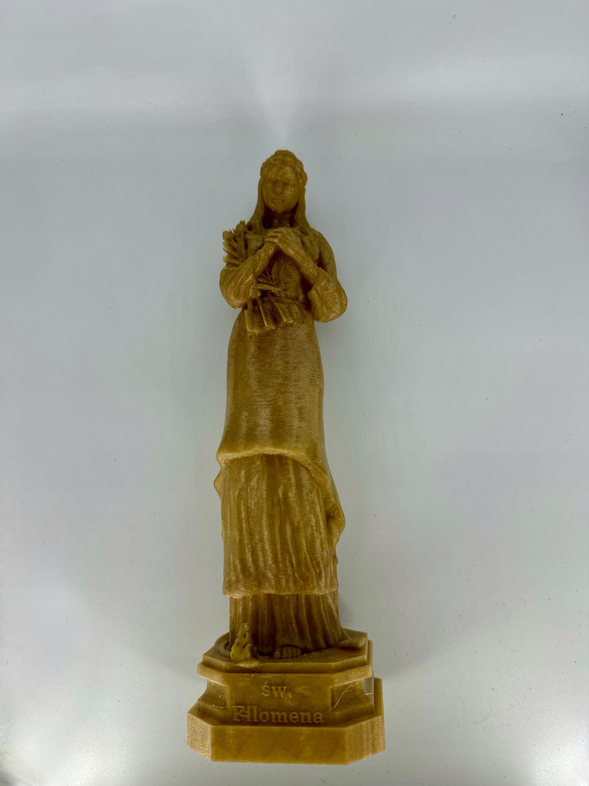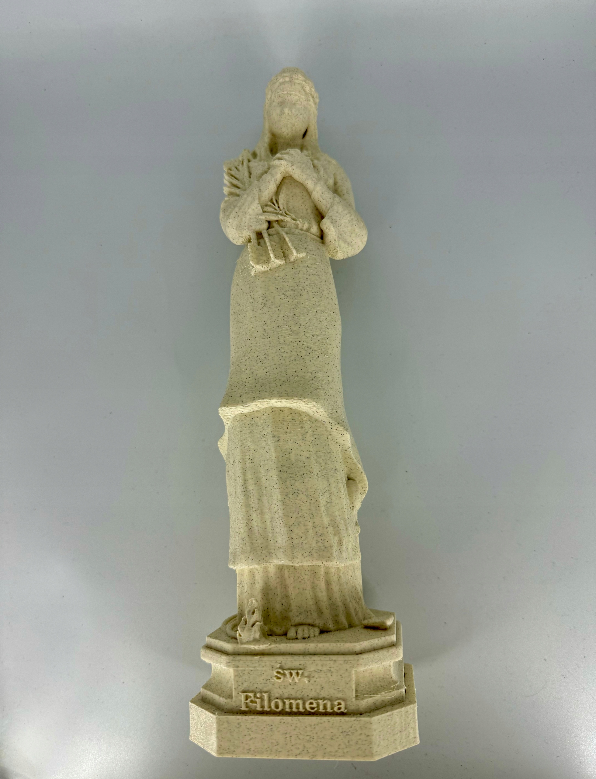 Pięknie wykonana figurka św. Filomeny, stworzona z wytrzymałego filamentu PLA przy użyciu najnowocześniejszej technologii druku 3D. Precyzyjne detale, takie jak wyrazista twarz i pofałdowania szat, są starannie odwzorowane, co czyni tę figurkę wyjątkowym elementem dekoracyjnym.
