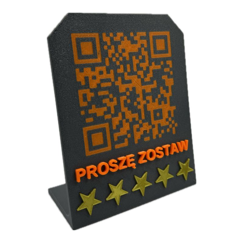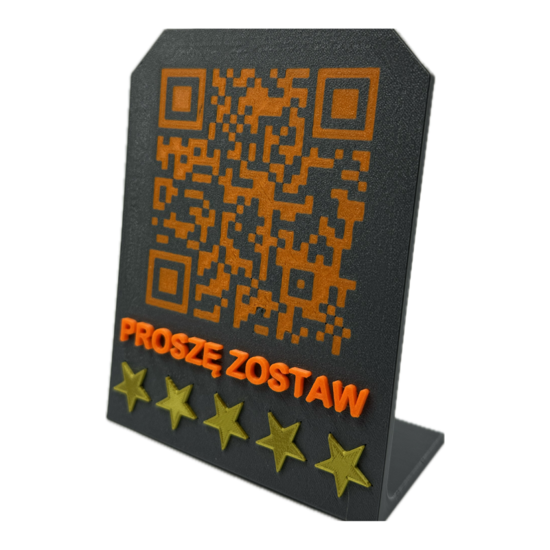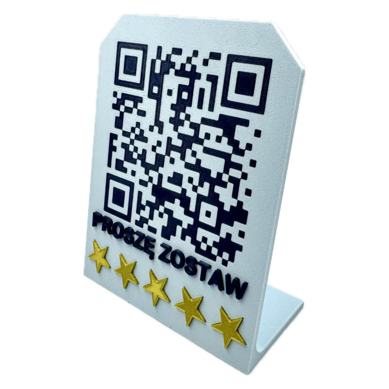 Tabliczka łączy funkcjonalność z eleganckim designem, skutecznie zachęcając klientów do dzielenia się opiniami. To kolejny przykład wykorzystania druku 3D w praktycznych rozwiązaniach dla biznesu!